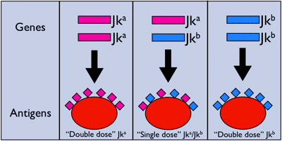A significant difference in antibody reaction strength depending on the quantity of the target antigen present on a target red blood cell. This is easiest to do with an example. Let’s look at the Kidd (“Jk”) blood group system. Like most blood group systems, the alleles in the Kidd system are inherited in a codominant manner. If a person has inherited alleles for both the Jka and Jkb antigens, both antigens will be expressed on that person’s RBCs (though the RBCs will have a smaller quantity of each antigen than if two copies of either allele). Because of that decreased quantity, we describe the Jk(a+b+) person as having a “single dose” of each antigen. On the other hand, let’s say that a different person inherits two copies of the allele for Jka (i.e., is homozygous for the allele for Jka), then that person will have a higher quantity of Jka than the Jk(a+b+) person (we say that the homozygous person’s RBCs have a “double dose” of Jka); see the figure below.
